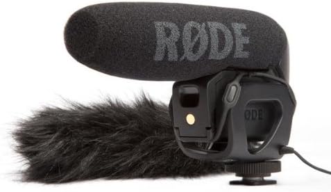 Image: The RODE Videomic Pro, a black shotgun microphone with a foam windshield, shown with an optional furry wind cover (dead cat) and its integrated shock mount. The RODE logo is visible on the foam windshield.