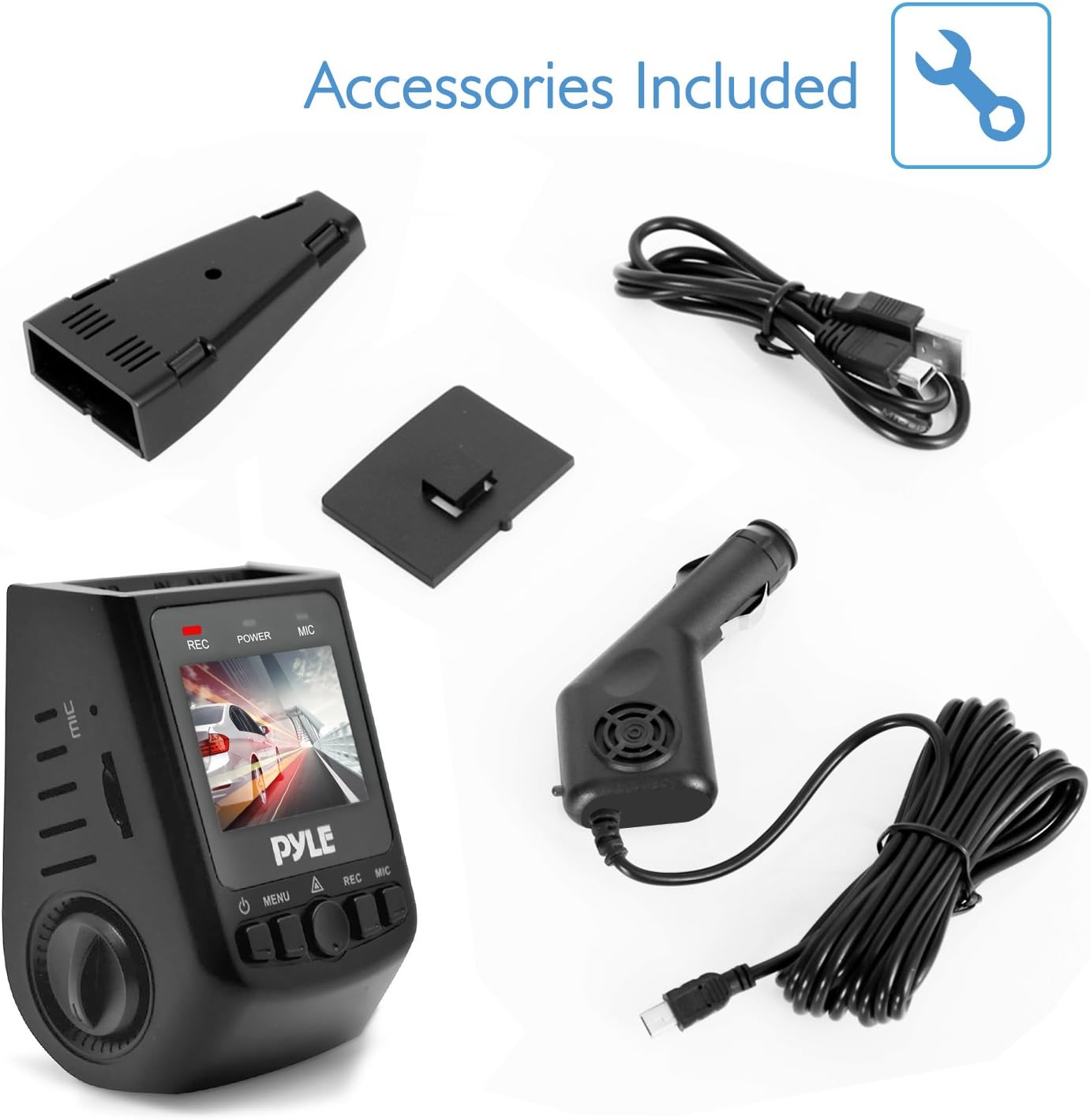 פיגורע 2.1: Included Accessories. This image displays the Pyle Dash Cam unit along with its USB car power cable, USB transfer charger, and a mounting bracket.