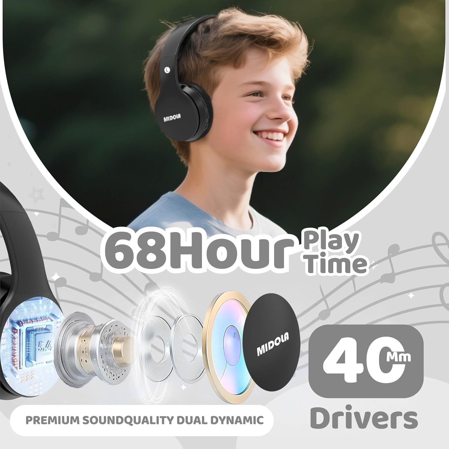 Image: MIDOLA B01 Kids Bluetooth Wireless Headphones highlighting key features like 68-hour playtime and 40mm dynamic drivers for premium sound quality.