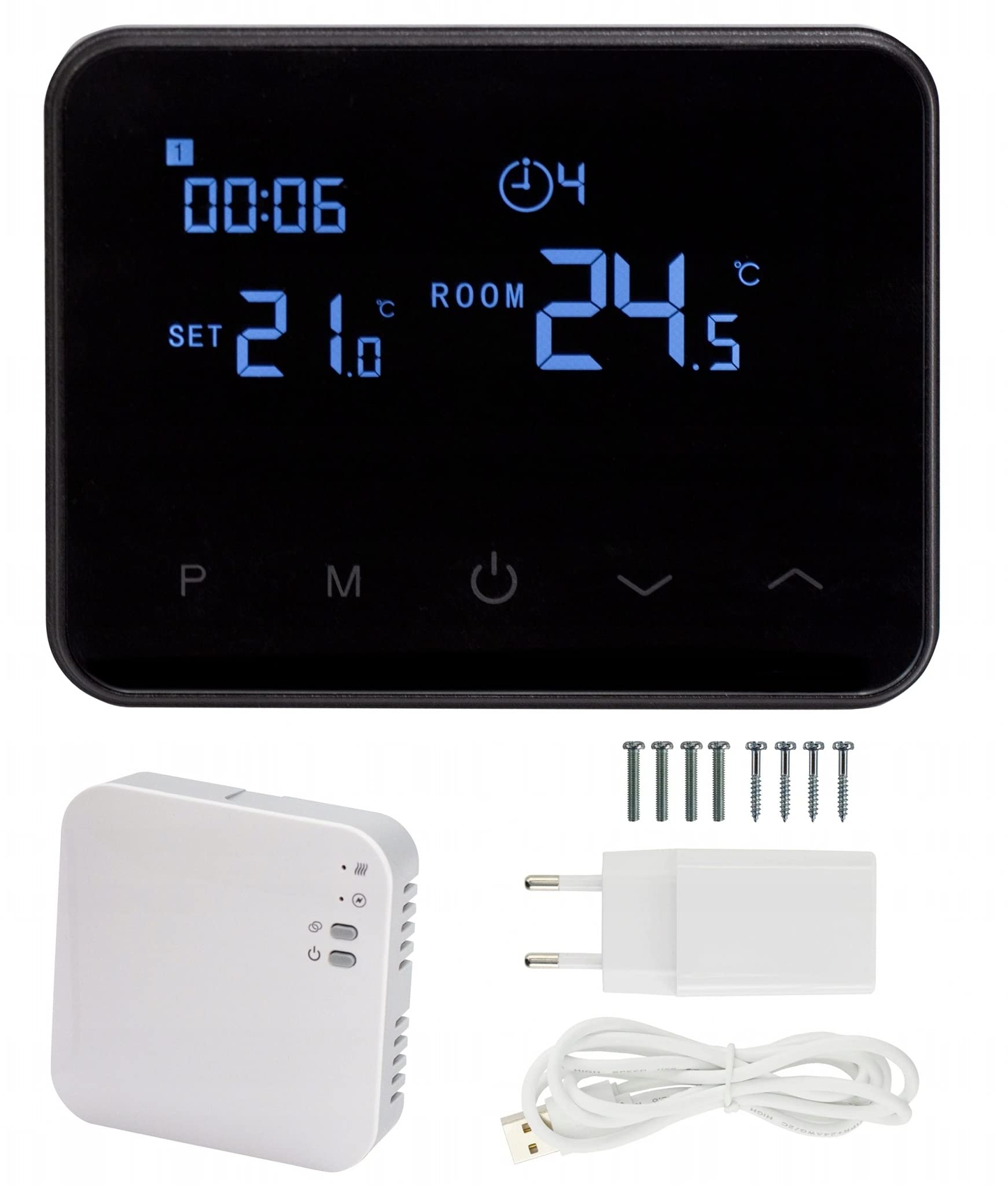 Carefully unpack all components. You should find the thermostat control panel, the receiver unit, a USB cable, and a power adapter.