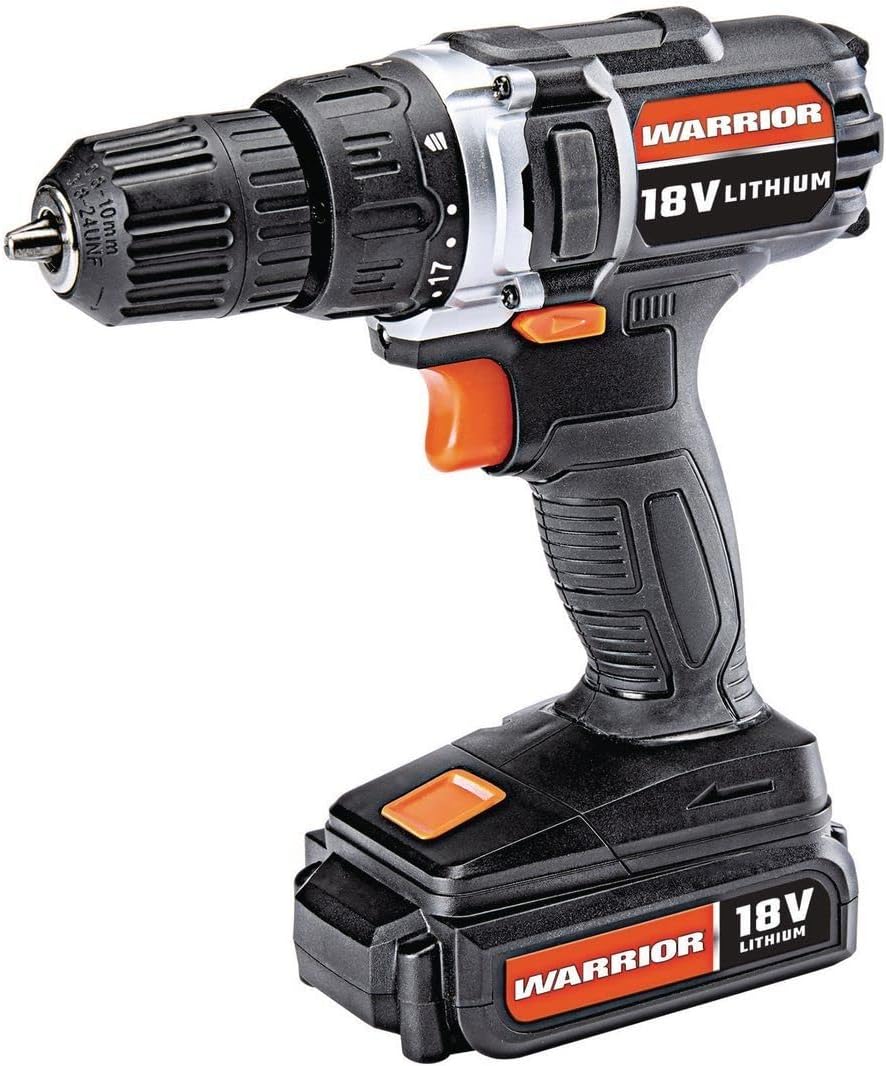 The Warrior 18V Cordless 3/8 Inch Drill/Driver Kit is designed for various drilling and driving tasks around the home and workshop. This versatile tool features a variable speed trigger, an electric brake, and 20 torque clutch settings for precise control. A keyless chuck allows for quick and easy bit changes, and a built-in LED light illuminates the work area for improved visibility in dark corners. The included 18V Lithium-Ion battery is interchangeable with other 18 Volt Warrior tools, offering convenience and flexibility.