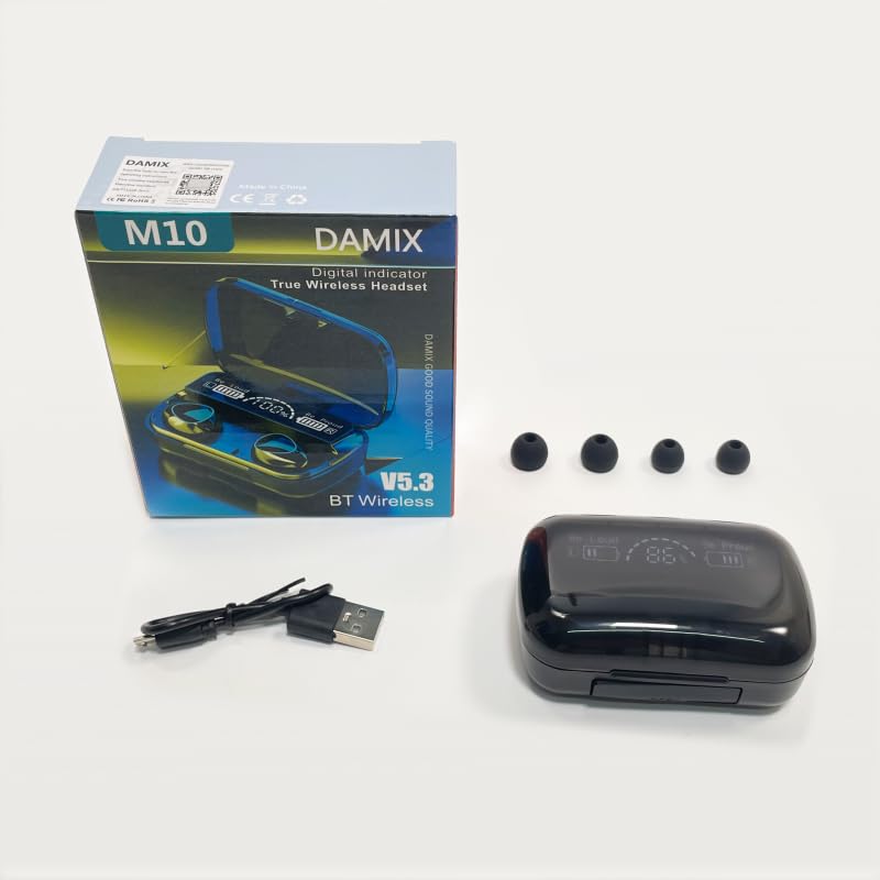 The Damix M10 Wireless Headset consists of two earbuds and a portable charging case. The charging case features a digital display that indicates the battery percentagפון די קעיס און די טשאַרדזשינג סטאַטוס פון יעדן אויערקנעפּל.