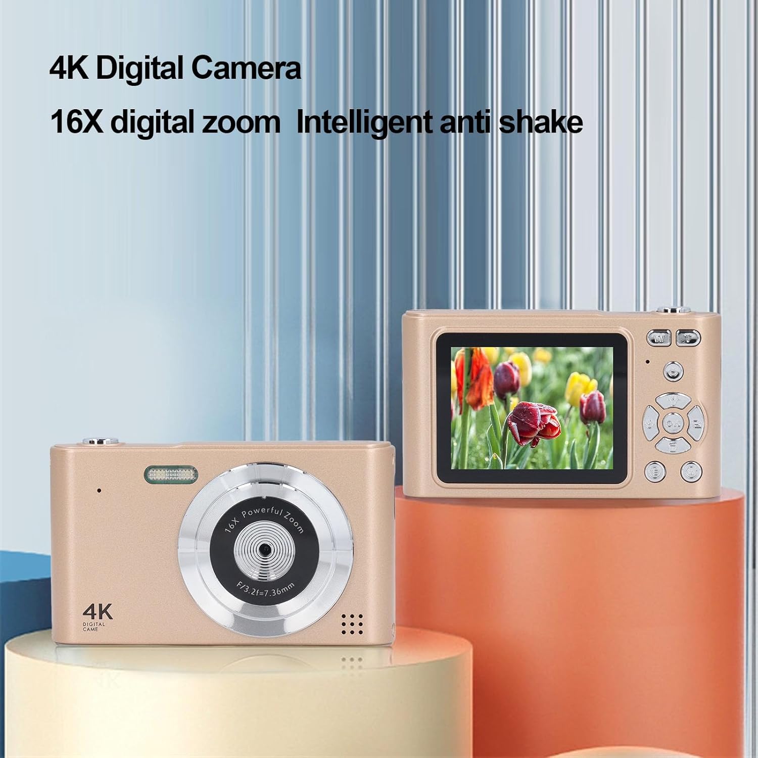 בילד: פאָרנט און הינטן view of the PUSOKEI 4K Digital Camera, highlighting its 4K capability, 16X digital zoom, and anti-shake feature.