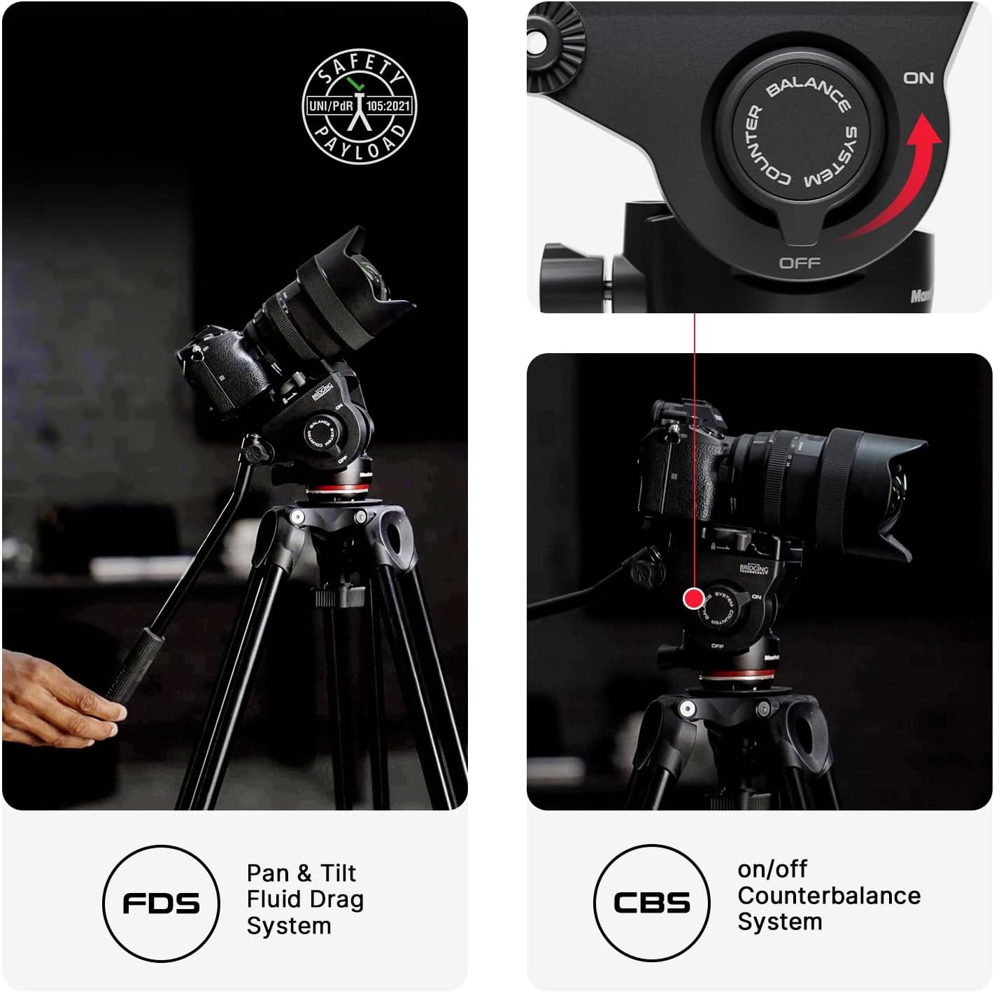 Image: The fluid head highlighting the Fluid Drag System (FDS) for pan and tilt, and the Counterbalance System (CBS) for camera stability.